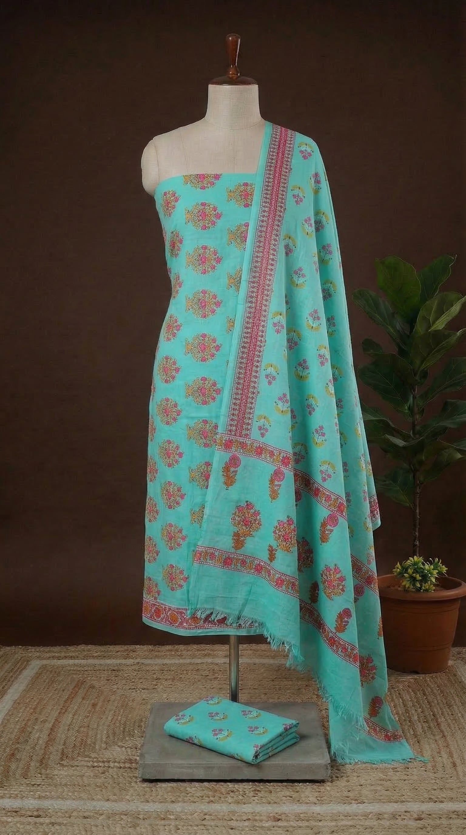Pink Kota Dress Material featuring a white printed cotton top that offers a soft and elegant look. Paired with a maroon and white printed cotton bottom for a stylish contrast. Completed with a maroon, pink, and white printed dupatta with a small zari border, making it a perfect choice for comfortable and graceful everyday wear.