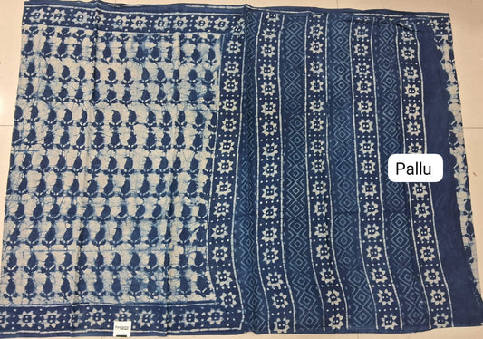 White with blue shibori printed mulmul cotton saree