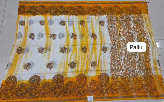 White,Elephant Grey and orange shibori printed mulmul cotton saree