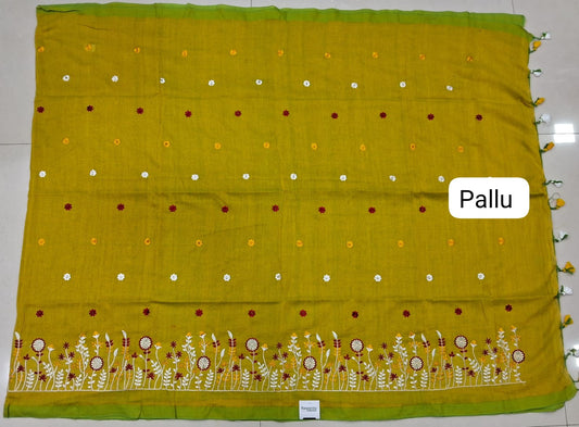 Dual tone ( olive green ) handpainted mulmul cotton saree