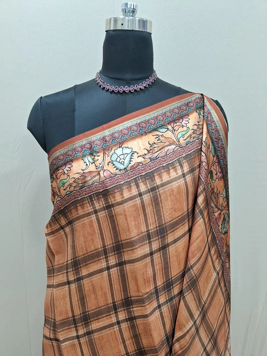 Light Brown Semi Tussar saree with a checked body