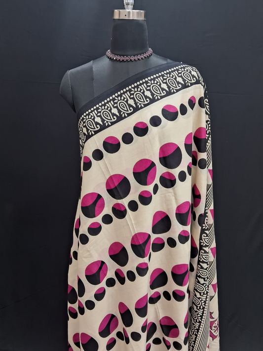 Cream, Black, and Magenta Geometric & Polka Dot Mulmul Cotton Saree