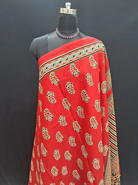 Rust Red & Ivory Hand-Block Printed Mulmul Cotton Saree