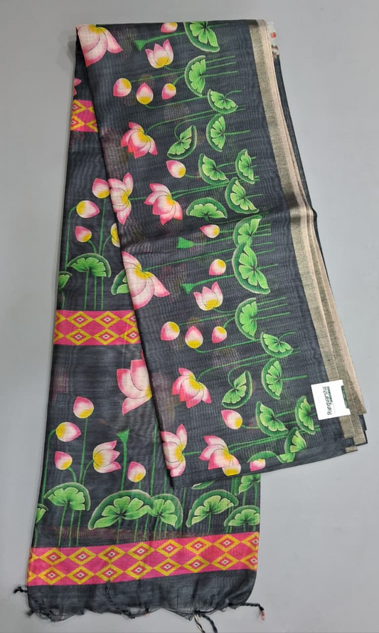 Elephant Grey Printed Jute Saree