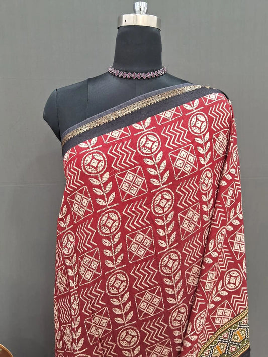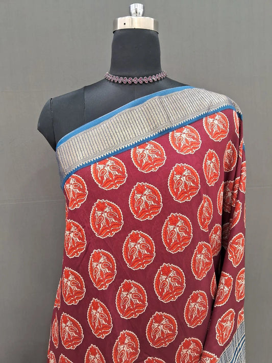 Peach, Brown, and Black Digital Printed Matka Silk Saree