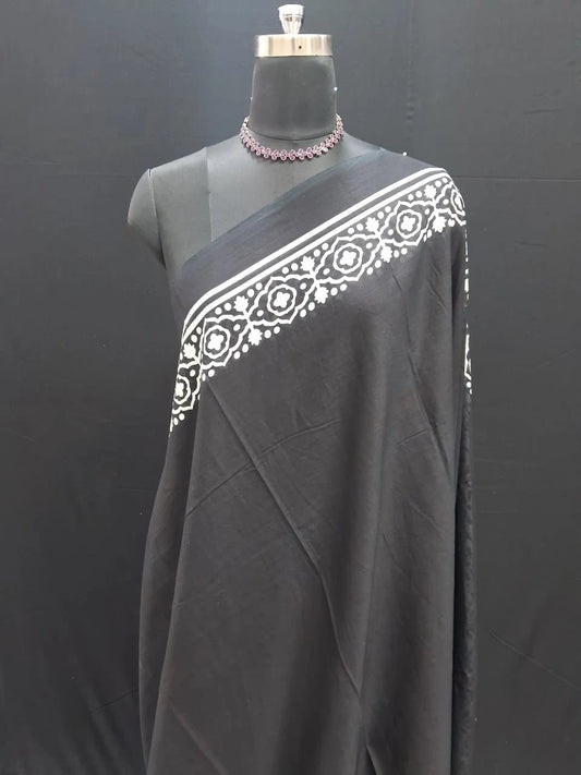 Traditional Beige & Black Floral Mulmul Cotton Saree