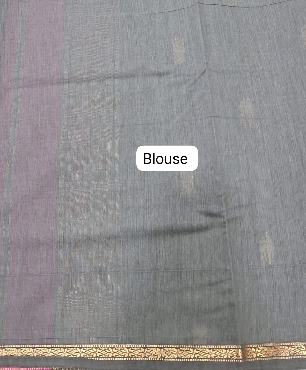 Fuchsia Pink Semi Maheshwari Silk Cotton Saree is styled with fine zari floral detailing on the body and a classic zari floral border. The contrasting grey floral pallu adds a soft, balanced touch. Matched with a plain grey blouse with border.