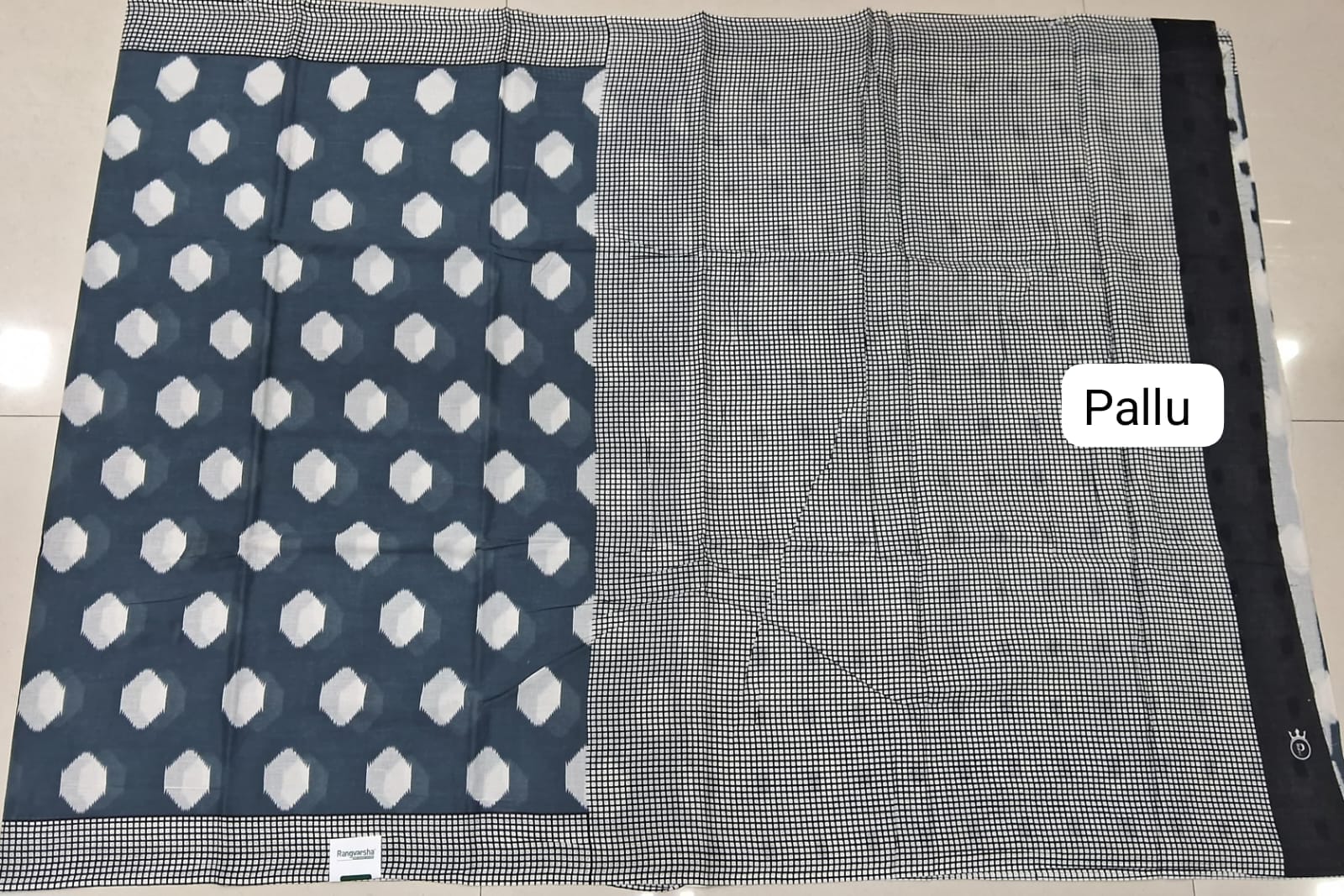 Metal Grey Mulmul Cotton Saree with white diamond printed body with white and black checked pallu and border. The saree comes with a white and black printed blouse.