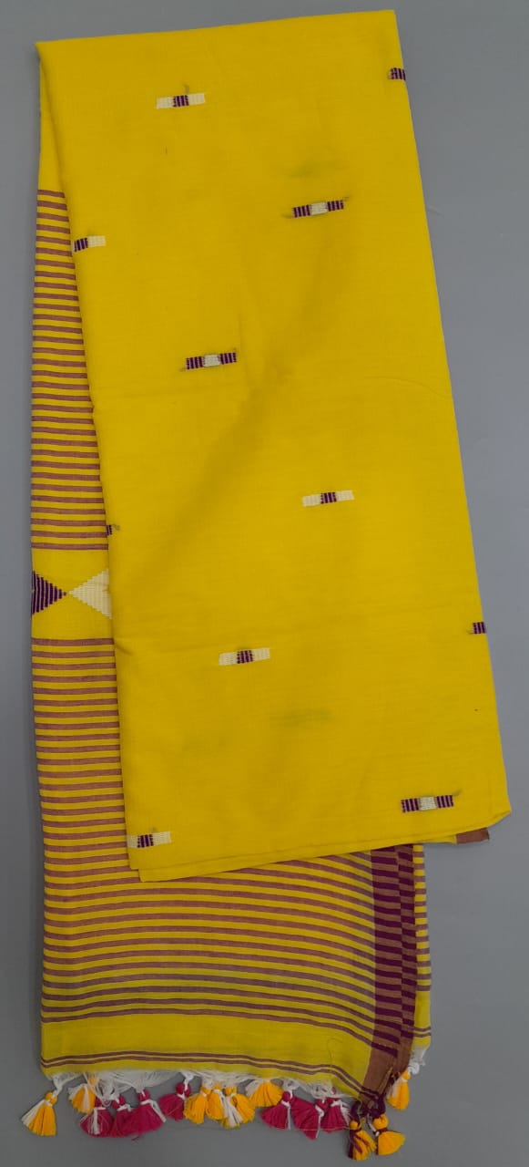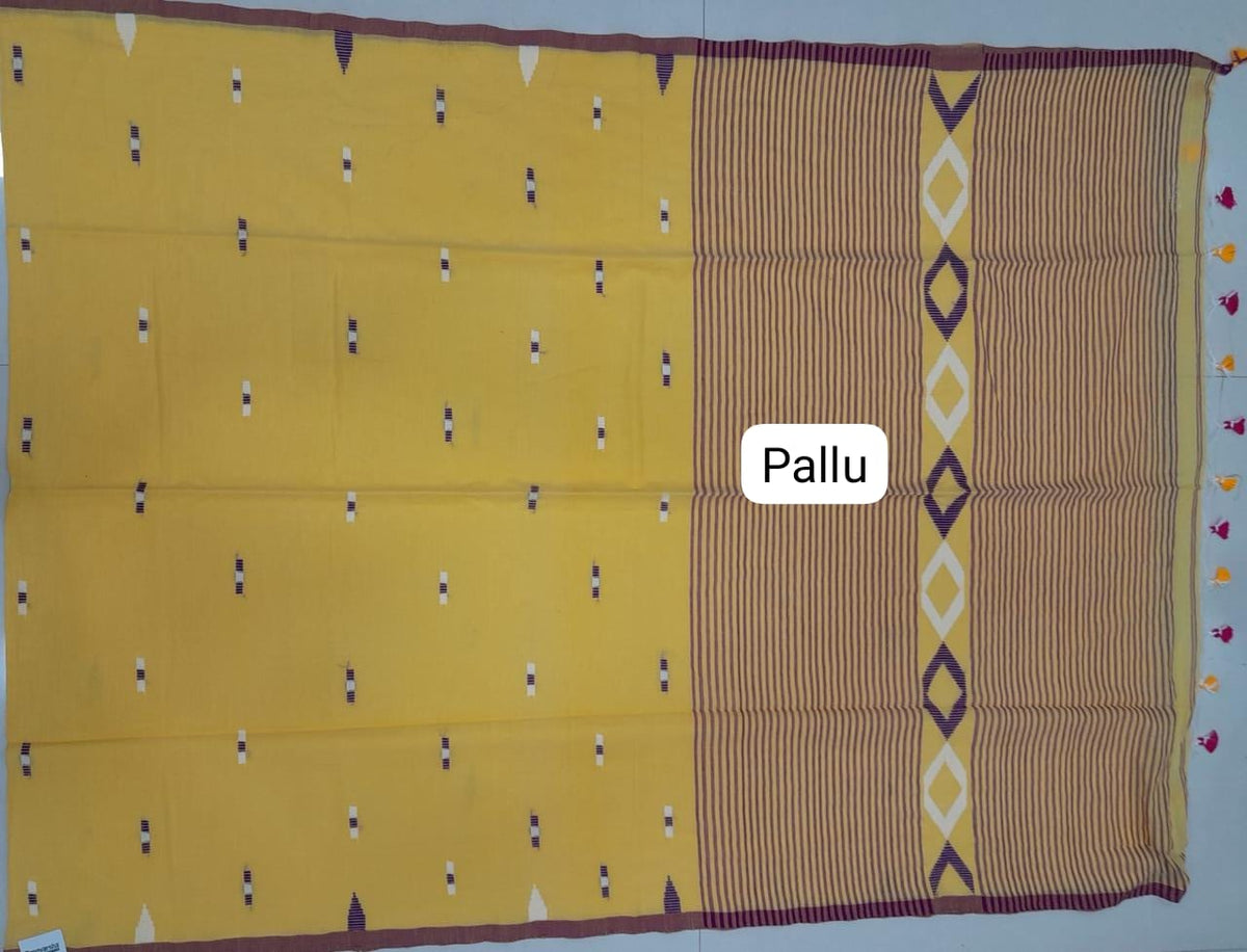 Mustard Yellow Khadhi Cotton Saree with White and Purple bhuttis on the body with purple lines on the pallu matched with brown border. It comes with a plain yellow blouse with brown border.