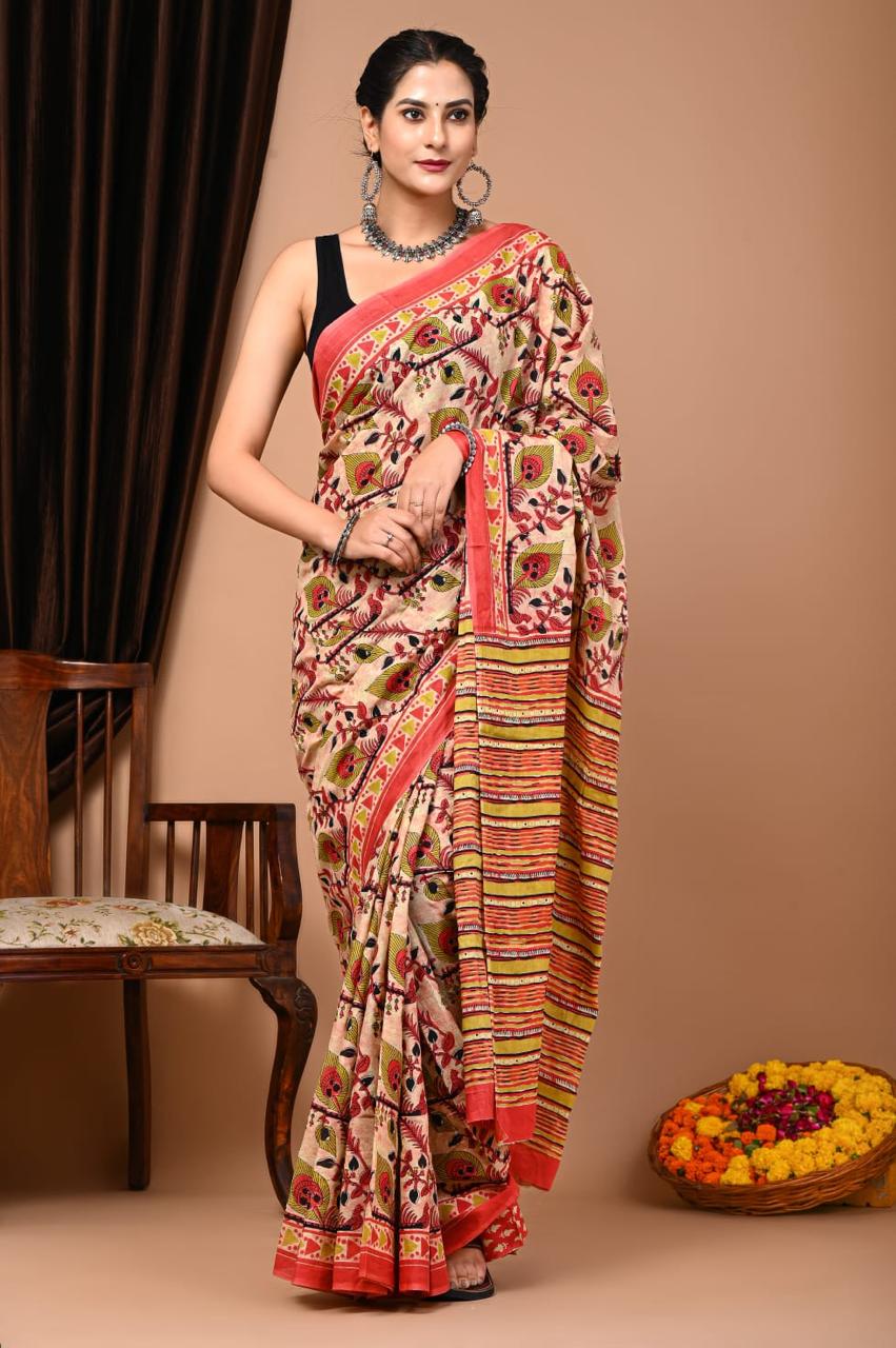 Peach Mulmul Cotton Saree with green and orange leaf printed body and pallu . The saree comes with a peach printed blouse.'