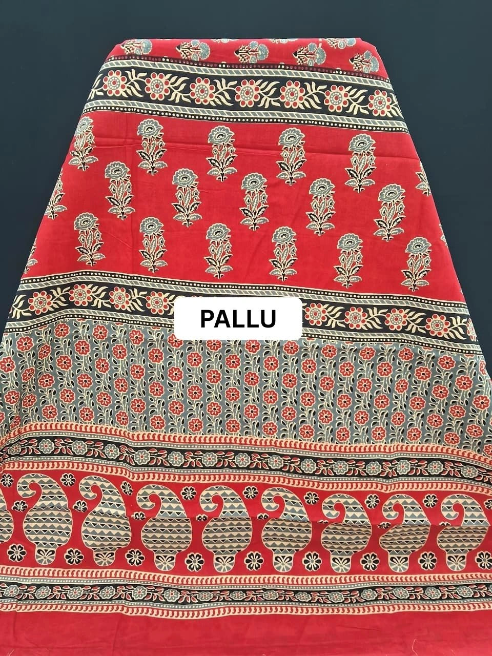 Red Mulmul Cotton Saree with black and grey flower printed body with floral printed pallu with red border. The saree comes with a red and cream printed blouse.