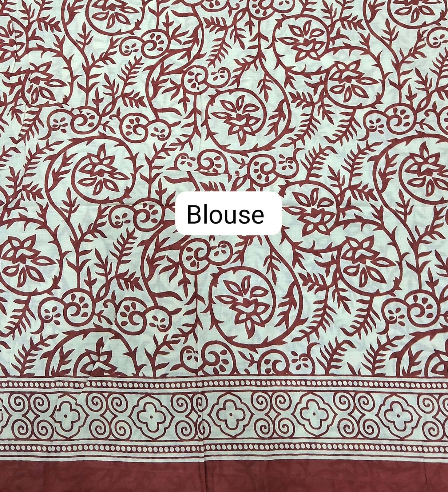Rust Red Mulmul Cotton Saree with white paisley motis on the body with printed border and floral printed pallu. The saree comes with a white and rust red printed blouse with border.