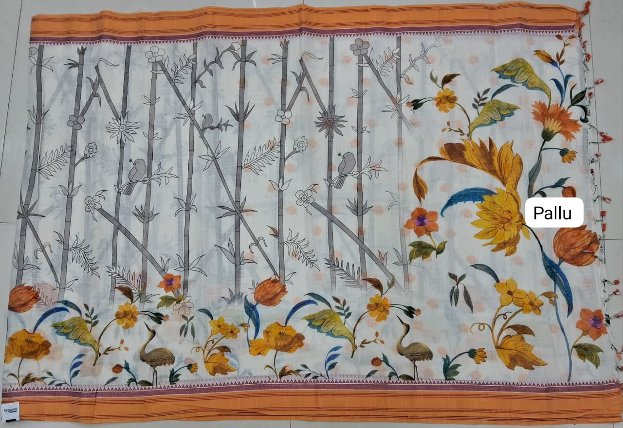 Graceful White Khadi Cotton Saree featuring elegant grey bird and floral prints across the body, complemented by a beautifully detailed flower-printed pallu. The yellow and maroon woven temple floral border adds a vibrant traditional touch. Paired with a white blouse adorned with yellow floral prints and border, this saree exudes natural charm and timeless elegance — perfect for casual and festive wear.