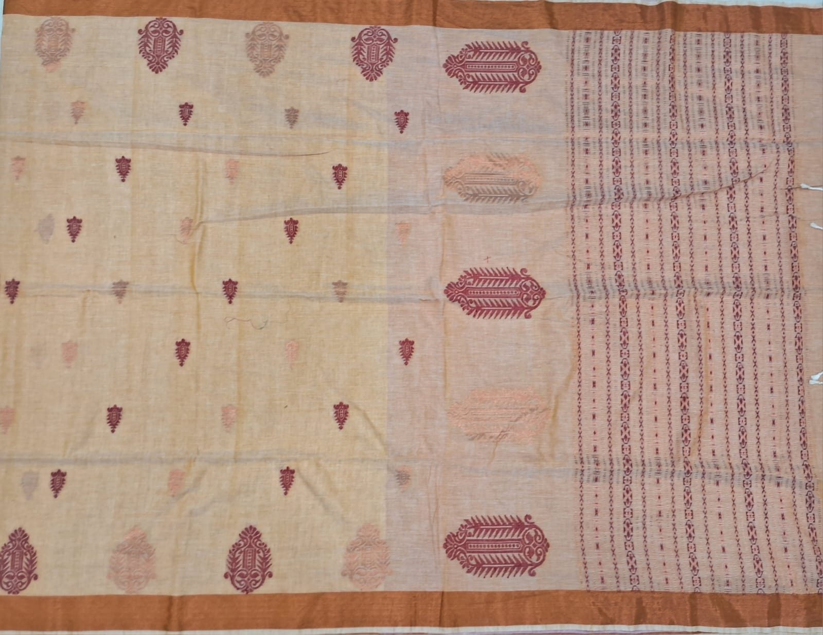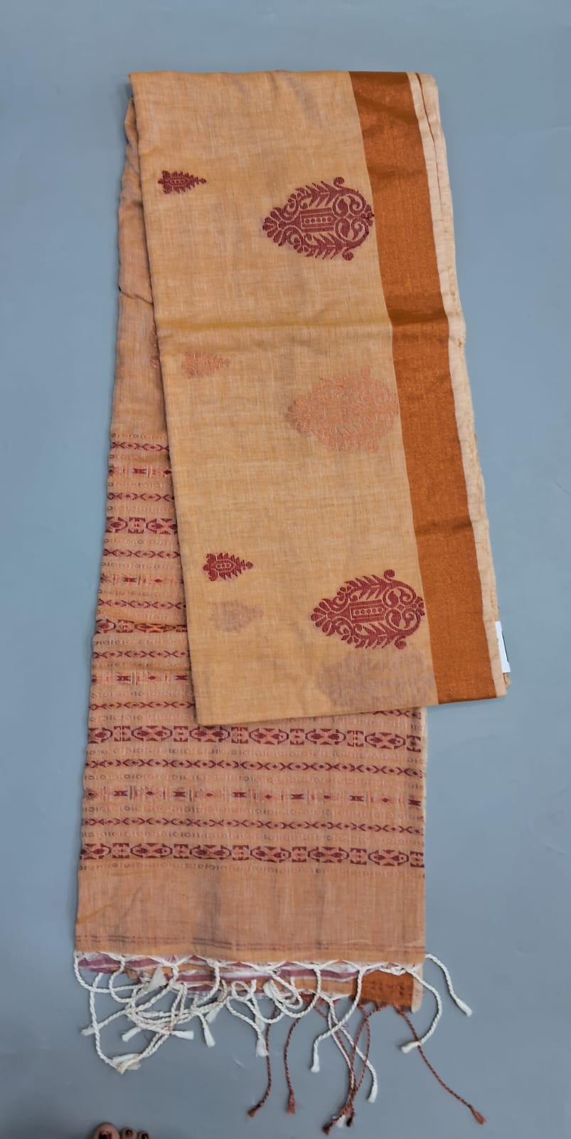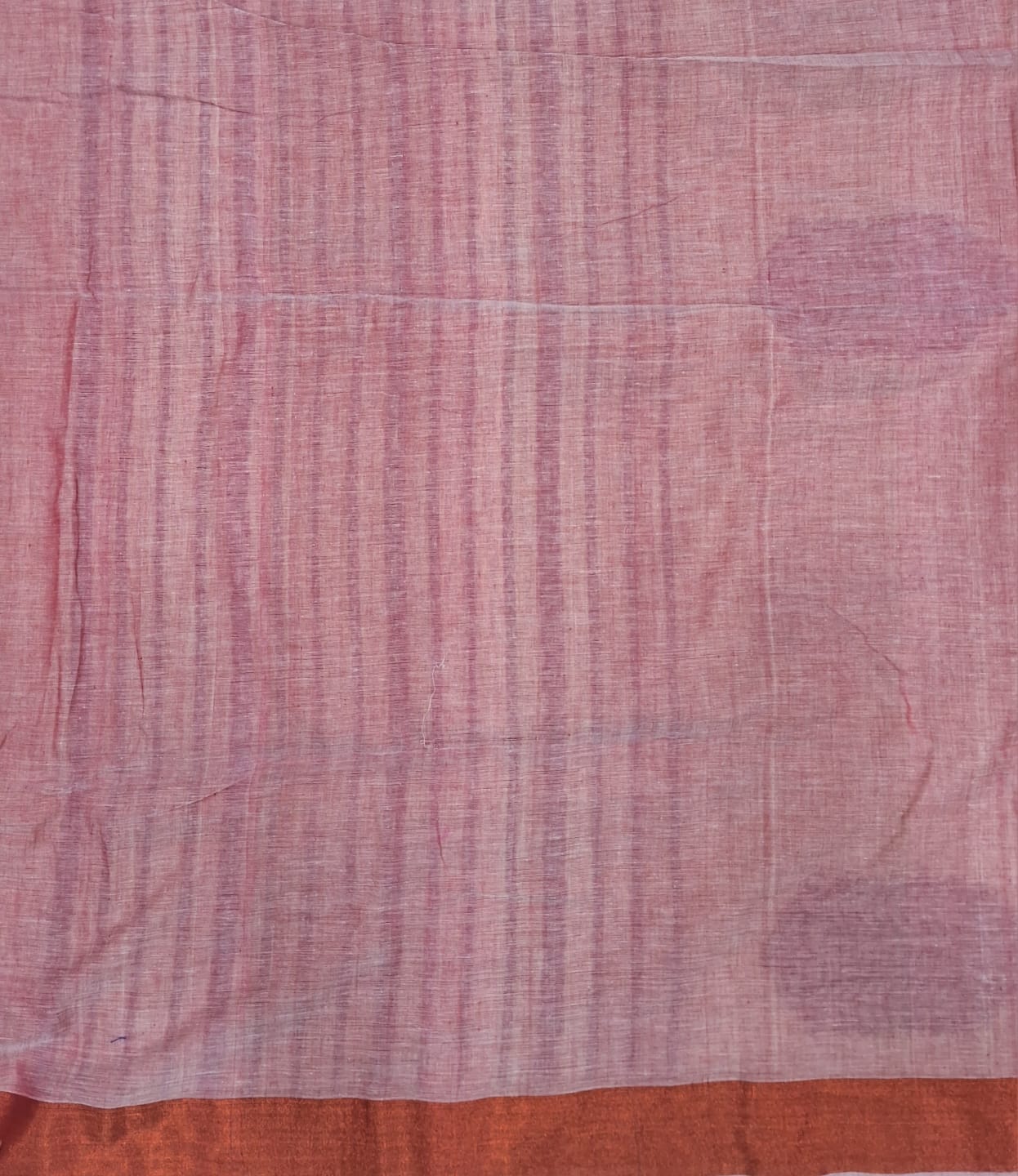 Wine Khadhi Silk Saree with multicolor motifs with with pink zari border with ikkat pallu .The saree comes with wine blouse with zari border .
